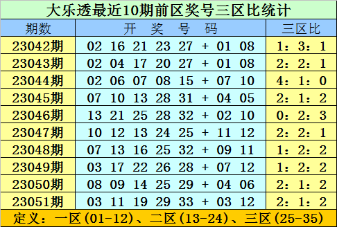 上期开奖:体彩大乐透第23051期奖号:03 11 19 29 33 + 03 12,前区奖号三区比为2:1:2。