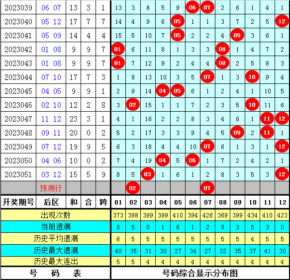 一区(01-12)分析:最近10期前区开出17个号码,号码奇偶比为7:10,偶号活跃。本期该区号码参考:06 07。