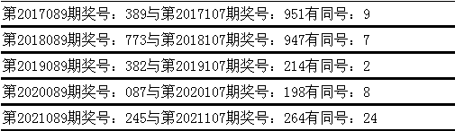 与前期历史同期奖号对比分析,在最近五年开奖中,第089期同期奖号与第107期同期奖号都出现了相同号码: