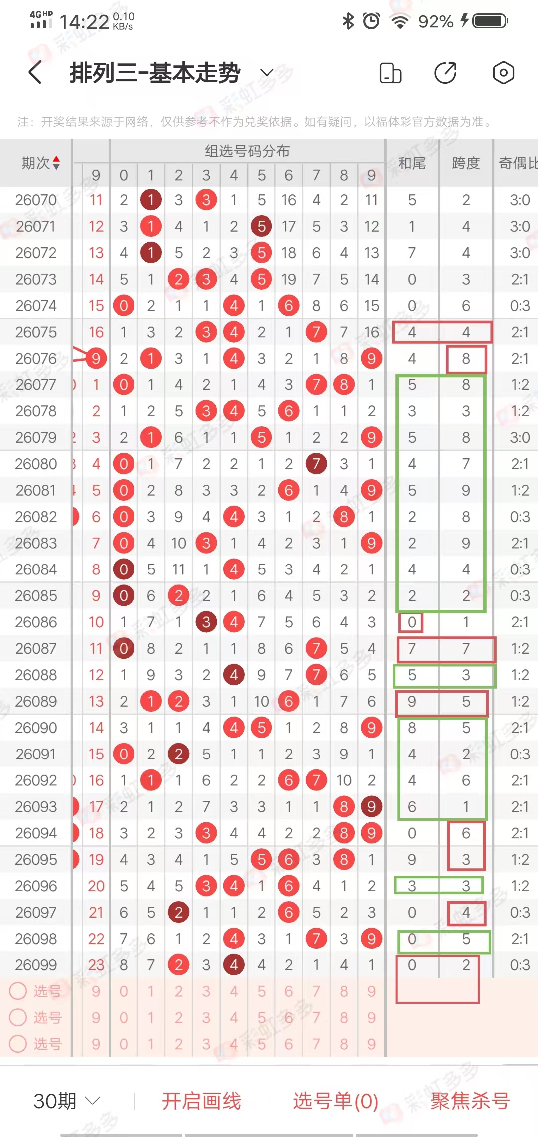 从近30期走势图,我们可以看出,上期和值尾和上期跨度,有很大概率不会出现在本期开奖号码,我们可以参考为杀号,上期和尾出现的概率是30期出8期,出号走势为011,01,01,000000000011,01,00000001,0,目前遗漏1期,有出号概率,上期和尾0,本期可以当作预防,2号是上期跨度,跨度出现下期的概率是7/30,出号走势为10000011,00000000001,01,000011,000,目前遗漏3期,有出号概率,本期可以当作预防,两个号同时出现极少,近30期同时出现3次,作为条件02可以选择0-1个出号