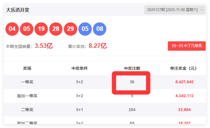 开奖结果回顾:上一期开奖号码04 05 19 28 29+05 08