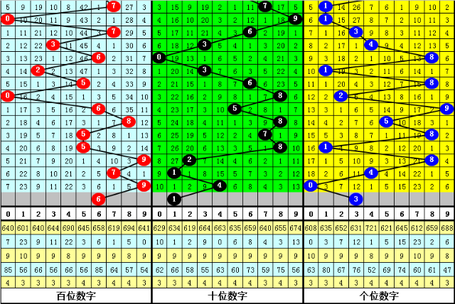 和值分析:在连续10期开奖中,和值分别开出:(6)→(19)→(10)→(20)→(21)→(20)→(14)→(19)→(12)→(13),和值升降平比例为5:5:0,上期和值上升1点,本期注意和值转向走小,关注和值10。