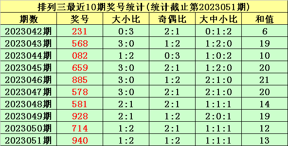 上期回顾:排列三第2023051期奖号为:940。奖号类型:组六,和值:13,奇偶比:1:2,跨度:9,大小比:1:2。