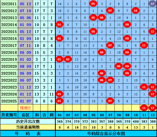 后区五码推荐:01、02、03、11、12