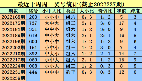 奖号类型判断:近期周一组六明显活跃,近十周开出6次,当前轮空2周,组三出现较少,本周一看好在组六。