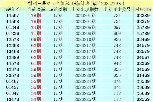 (4)排列三第2023279期遗漏值最大的十个5码组六组合解冻了1个;