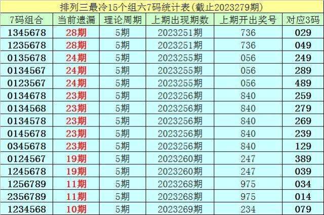 (1)在排列三已开出的6700期奖号中(统计截止第2023279期),目前7码组六遗漏值最大的组合为:1345678、1235678,本期遗漏28期;