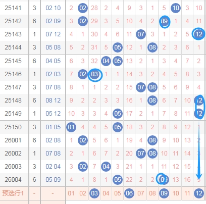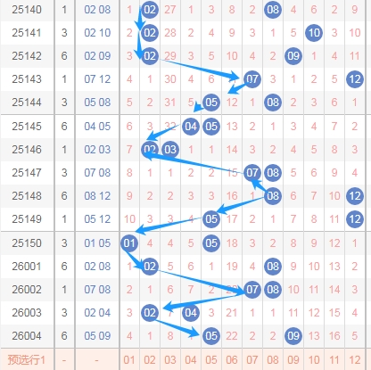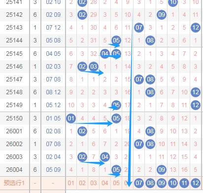 上图是体彩大乐透后区开奖号码分布走势图,你们看上面的蓝色箭头,个人觉得本期号码全部出01到06这个区域的概率小,那么就有两种可能,第一种就是号码全部出在07 08 09 10 11 12,还有一种就是号码01到06这个区域出一个,号码07到12这个区域出一个。