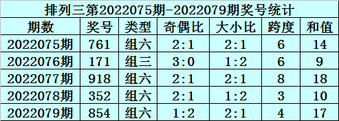 跨度分析:最近5期分别开出跨度:5、7、2、6、5,本期预计跨度走大,一码跨度参考6。