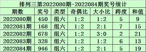 上期回顾:排列三第2022084期开奖号码为946。奖号类型为组六,奇偶比为1:2,大小比为2:1,跨度为5,和值为19。