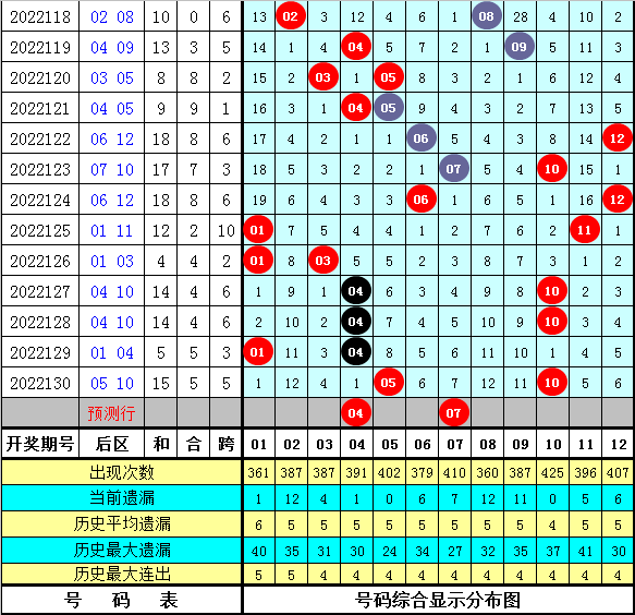 后区分析:在第131期历史同期开奖中,后区奖号全奇组合开出4次,全偶组合开出4次,一奇一偶组合开出6次,本期后区预计出现一奇一偶组合,看好号码04、07、10、12。