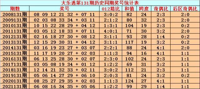 综上所述,大乐透第2022131期前区012路比参考1:1:3。