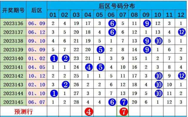 上期后区号码为06号和07号,为小大、偶奇组合,近5期后区小大组合出现3期,偶偶组合出现2期,奇奇组合出现0次。本期大范围看好号码01 04 06 07 12,重点推荐小大、偶奇组合04 07。