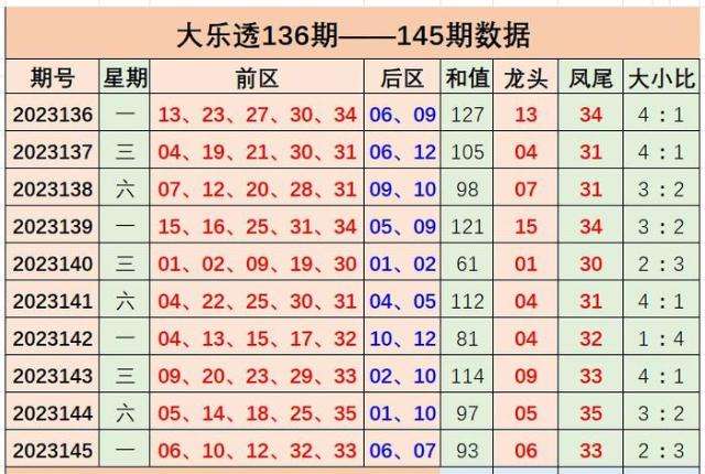 大乐透第2023145期开奖号码:前区06 10 12 32 33,后区06 07;龙头06,凤尾33,和值93,跨度27,前区号码区间比3:0:2,012路比3:1:1,奇偶比为1:4,大小比为2:3,冷热比3:2,0枚重号,1组连号。