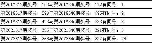 与前期历史同期奖号对比分析,在最近五年开奖中,第317期同期奖号与第340期同期奖号都出现了相同号码:
