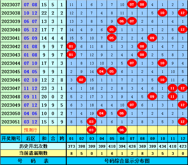 后区分析(定义:01-04为一区,05-08为二区,09-12为三区):上期后区开出奖号03和12,分别出现在第一区和第三区和区,最近10期后区三个区间落号个数比为6:6:8,本期后区注意第一区和第二区号码出现,关注两码03、06。