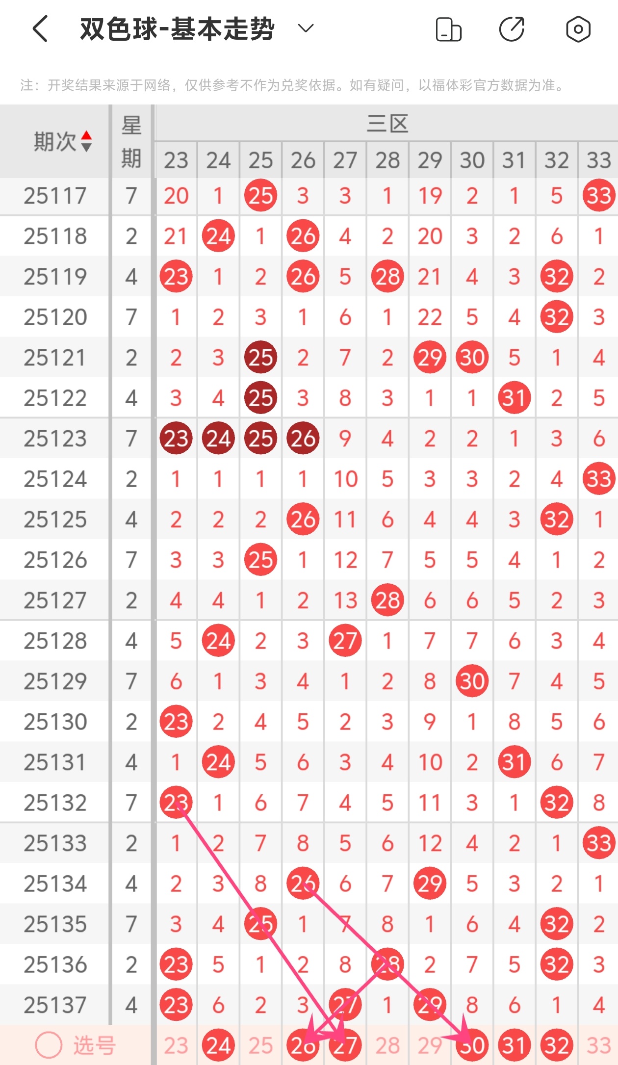 下面双色球的第三区间走势图分析: