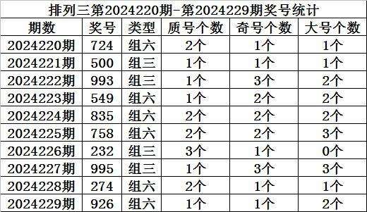 上期回顾:排列三第2024229期开奖:926,质合比为1:2,奇偶比为2:1,大小比为1:2。