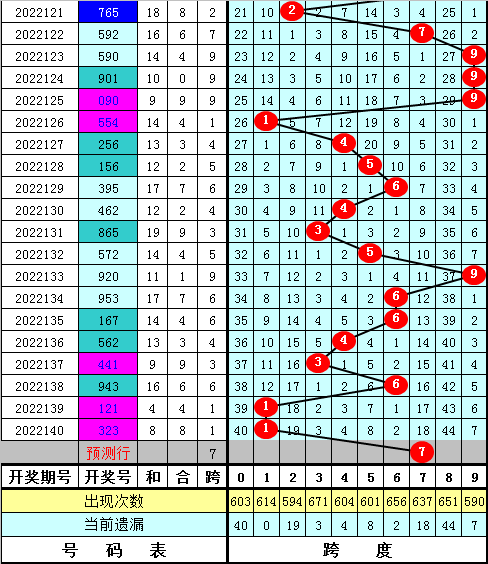 福彩3D第2022140期最大跨度开出1,近期最大跨度波动较大,本期预计最大跨度在5-9区段开出,最大跨度参考6789,一码跨度参考7。