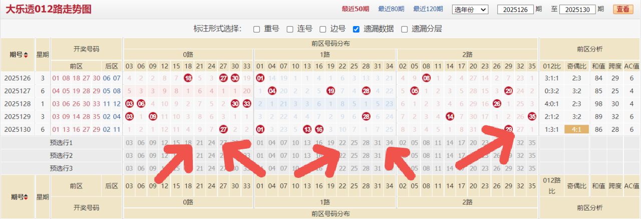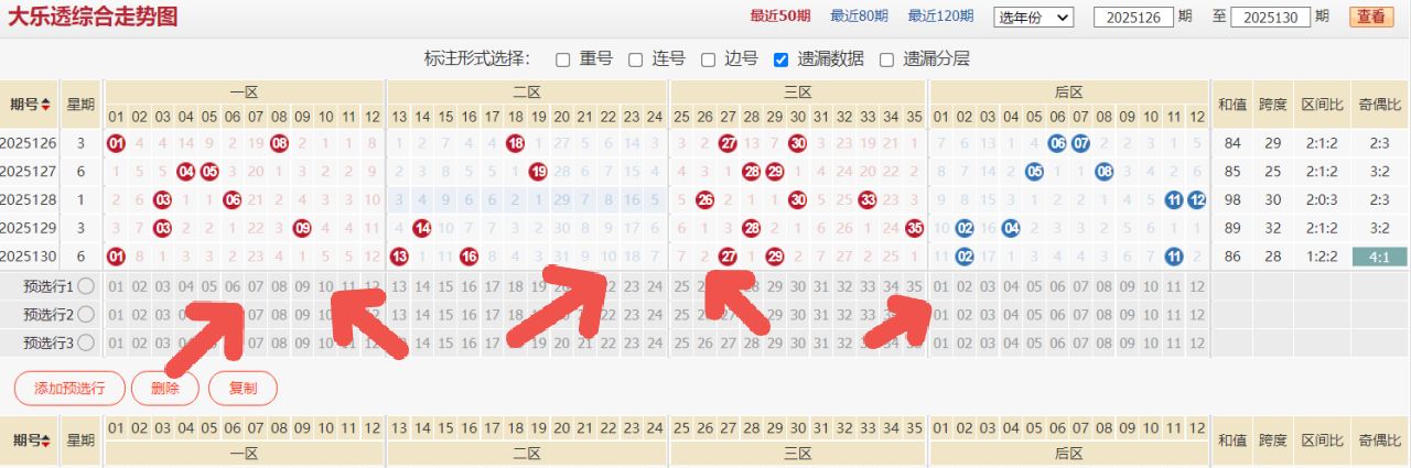 上期大乐透的开奖号码为: 01 13 16 27 29+02 11,和值为86,跨度为28,区间比例为1:2:2,奇数偶数比例为4:1,012路比例为1:3:1,上期号码主要有一个路数连号和一个奇数连号构成。那么这样的一个走势维度,使得目前的整体奇数热度要远远高过偶数号码热度。本期号码需要去调整的数值比例的空间还是比较大的。有关于奇数偶数的调整。也有关于路数对于零路和二路号码热度的上升调整。这是本期大乐透号码的初始基本思路。