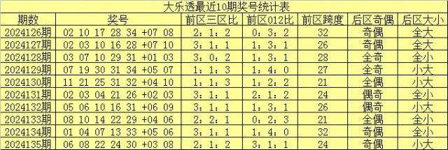 大乐透第2024135期奖号开出:06 08 22 24 30 +03 08。其中前区三区比为2:1:2,012路比为3:1:1,后区开出一大一小、一奇一偶奖号。