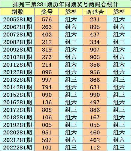 排列三从2004年开奖至今已开出6701期奖号了,其中第281期历史同期奖号出现18次,历年第281期分别开出号码:576、263、403、212、819、273、214、096、997、794、090、136、808、106、005、951、597、101。