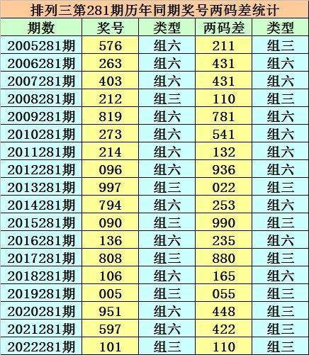 在排列三第281期历史同期开奖中,各号码两码差分别为:112、134、134、011、178、145、123、369、022、235、099、235、088、156、055、448、224、011;