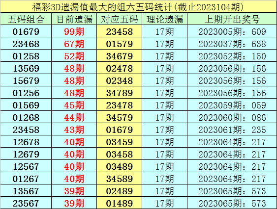 3。福彩3D第23104期10个遗漏最大的五码组六开出1个。