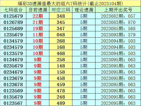 1。截止第23104期,七码组六遗漏最大的是:0125679,当前遗漏22期。