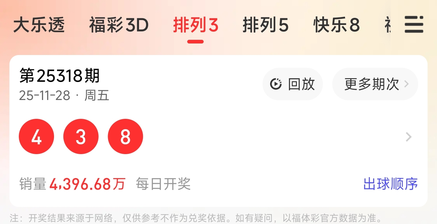 上期开出438,和尾为5,跨度为5,奇偶比为1:2,大小比为1:2,012路个数对比为1:1:1。