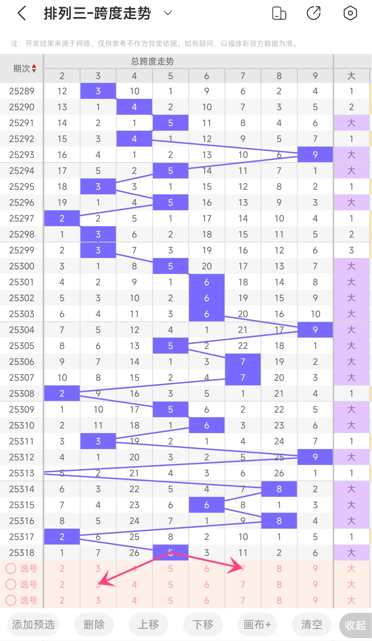 上期跨度为5,往前一期跨度是2,趋势往右移动,偏移量为3。跨度值5时,跨度值是近30期内开出的中间位置的值。通过走势图分析,目前的趋势是可能往左也可能往右。所以推测本期跨度可能为23679等跨度。