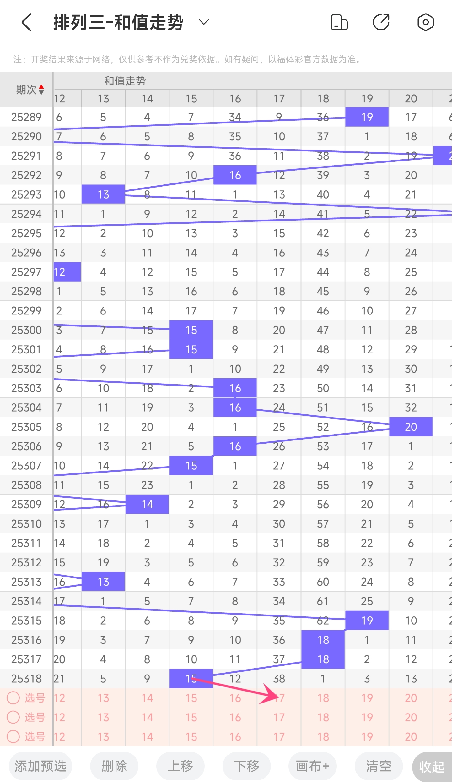 上期和值为15,往前一期和值为18,趋势往左移动,偏移量为3。通过走势图分析,15和值是近30期内开出的中间位置的和值,下降空间和上升空间差不多。本期看好和值变大,因此推测本期趋势是往右的,和值会变大,小概率往左,和值变小。