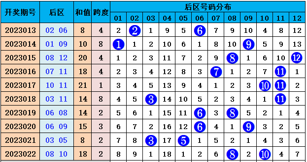 和值分析:上期后区和值为18,比前期上升10个点位,预测本期和值走势变化下降,推荐和值区间10--15