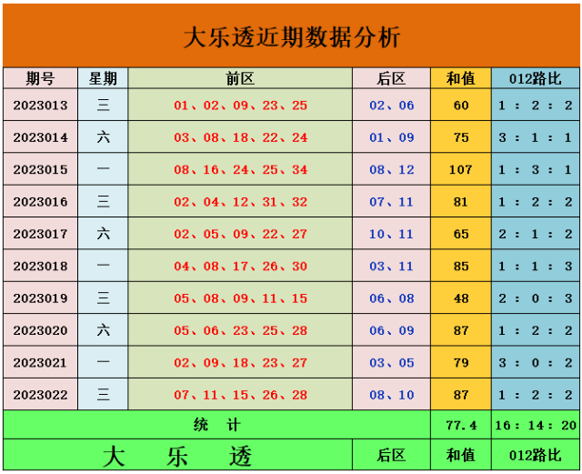 上期回顾:大乐透第2023022期奖号:前区07、11、15、26、28,后区08、10。前区奖号和值为87,三区比为2:1:2,后区开出大大组合08、10