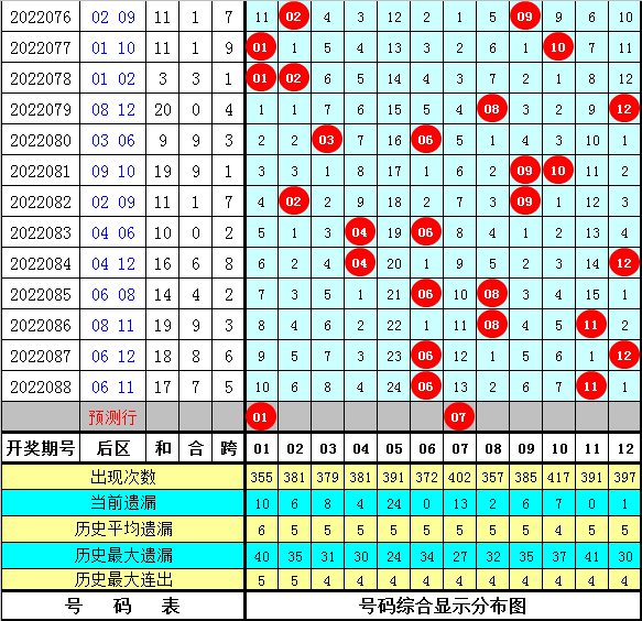 万妙仙大乐透第2022089期后区冷热号码统计: