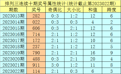 上期回顾:排列三第2023022期奖号:114。类型:组三,奇偶形态:奇奇偶,大小形态:小小小,和值:6,跨度:3。