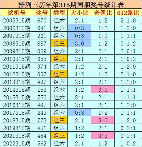 奇偶分析:历史上排列三第315期同期奖号中,奇偶比0:3出现1期,奇偶比3:0出现2期,奇偶比1:2、2:1出现7期,奇偶奖号总比例开出27:24,奇数号码相对活跃,今年第315期预计奇数号码再次走热,关注奇偶比为2:1。