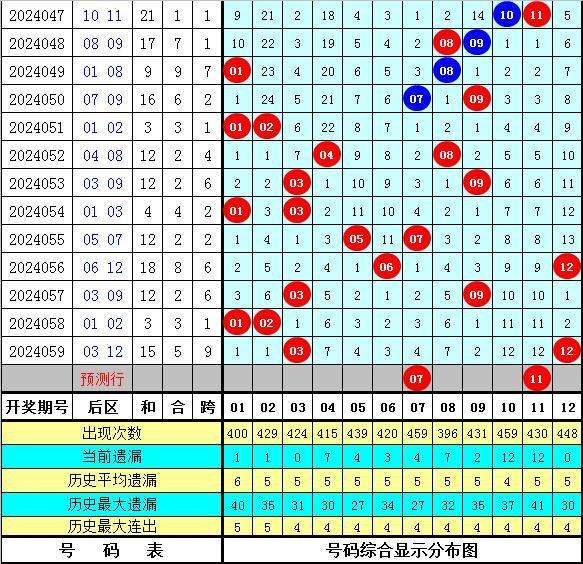 9。在历史同期奖号中,后区号码10出现5次;05 11出现4次;03 04 08 09 12出现3次;01 07出现2次;02 06出现1次。