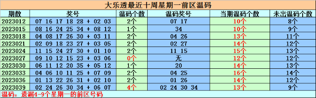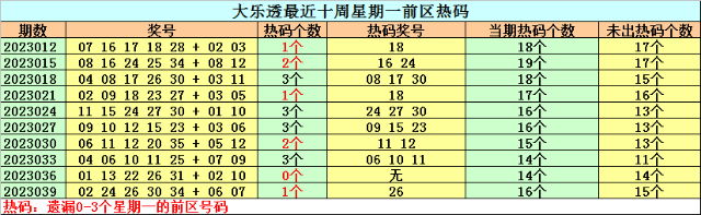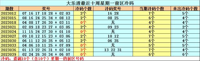 冷号分析:前区冷号在最近十周星期一开出13个,平均每期有1。3个,冷号明显解冻,上周星期一冷号没有出现,冷号没有出现,本周星期一不看好冷号解冻。
