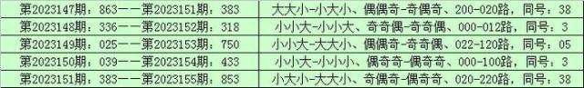 则,排列三第2023152期奖号:318,与排列三第2023156期奖号可能有相同的号码。且排列三第2023156期奖号大小比、奇偶比和012路比可以参考第2023152期奖号形态:小小大、奇奇偶和012路。