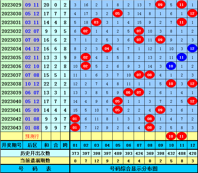 后区分析:上期后区开出1路+2路号、一质一合组合,最近10期后区奖号012路比为5:7:8,质合比为9:11,本期看好后区在03、08、09、10、11之内落号,精选后区奖号10、11。