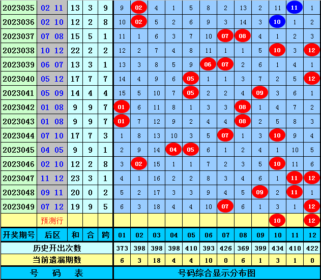 后区分析:上期后区开出第二区和三区号码07+12,最近10期后区三区落号比为0:1:1,最近5期后区三区落号比为1:1:0,本期后区号码大范围关注01、05、06、10、12,后区精选两码10、12。