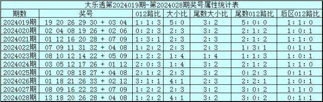 体彩大乐透第24028期奖号为:13 18 20 26 28+04 08,其中前区奖号012路比为1:2:2,大小比为4:1,奇偶比为1:4,包含同尾奖号:18 28。