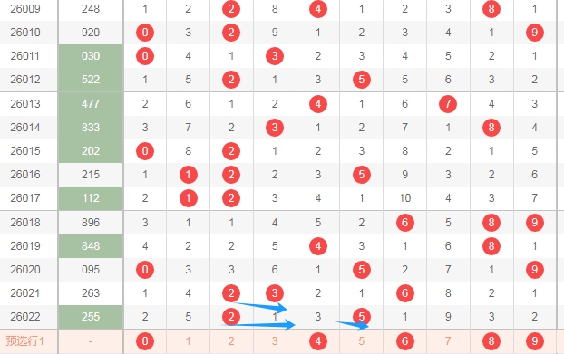 上图是体彩排列三开奖号码走势分布图,我在上面图中标注出来的数字都是合数04689,上期开奖号码是全质数组合,最近两期开出的号码都是质数多,合数少,那么本期这个合数大家至少得关注出一个,小心出两个 或者三个的,也就是合数04689至少得出一个。