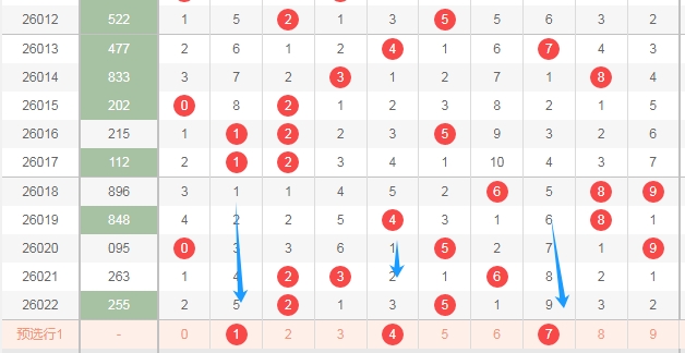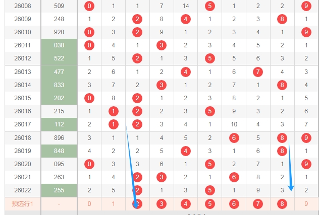上图是体彩排列三开奖号码走势分布图,我在上面图中标注出来的数字1路球数字,你们看上面走势图中标注出来的蓝色箭头就知道,最近1路球数字147连续三期没出号码,那么本期大家要留意一下出1路球数字。