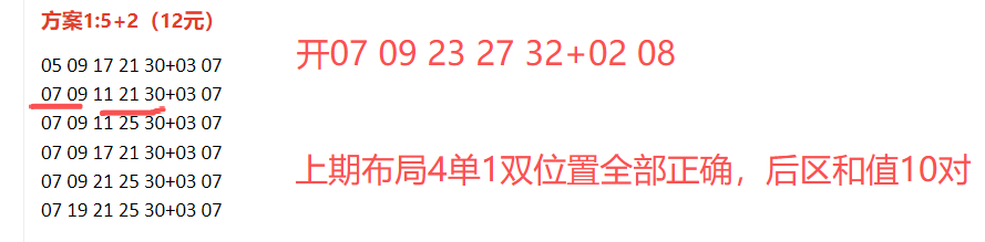 首先回顾大乐透上期开奖结果:07 09 23 27 32+02 08.上期看奇偶比4:1正确,位置都对得上,后区和值看10对。