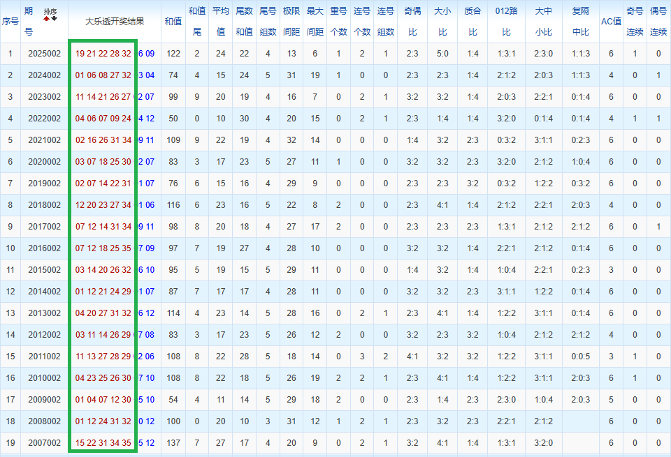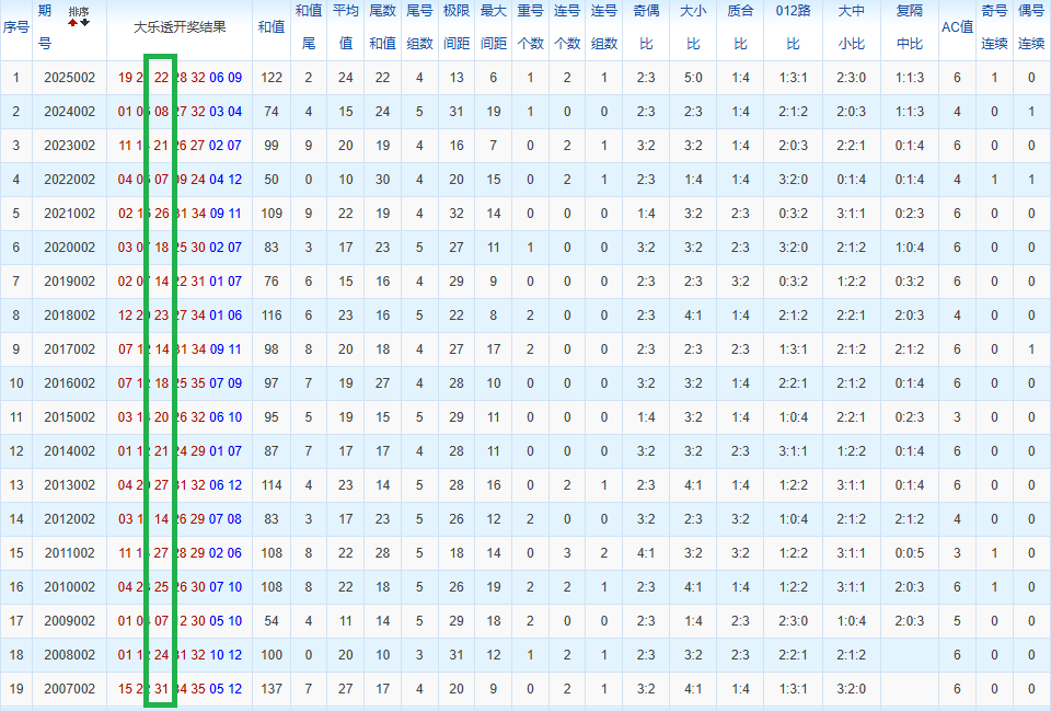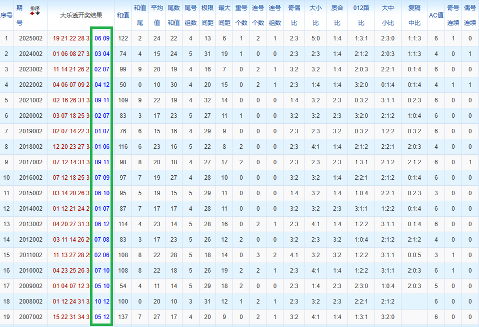 通过观察,我发现往年同期的开奖数据与本期号码之间存在显著关联。具体来说,在前区号码中,从第一位至第五位,通常会有约三个位置上的数字与往年同期相同位置的号码一致;而后区号码中,也有多期开奖结果直接包含了往年同期的数字。因此,我们可以借助往年同期各位置上的号码,作为分析本期开奖情况的重要依据。在此基础上,还可结合往年同期的其他相关条件,进行综合性的号码组合推荐。