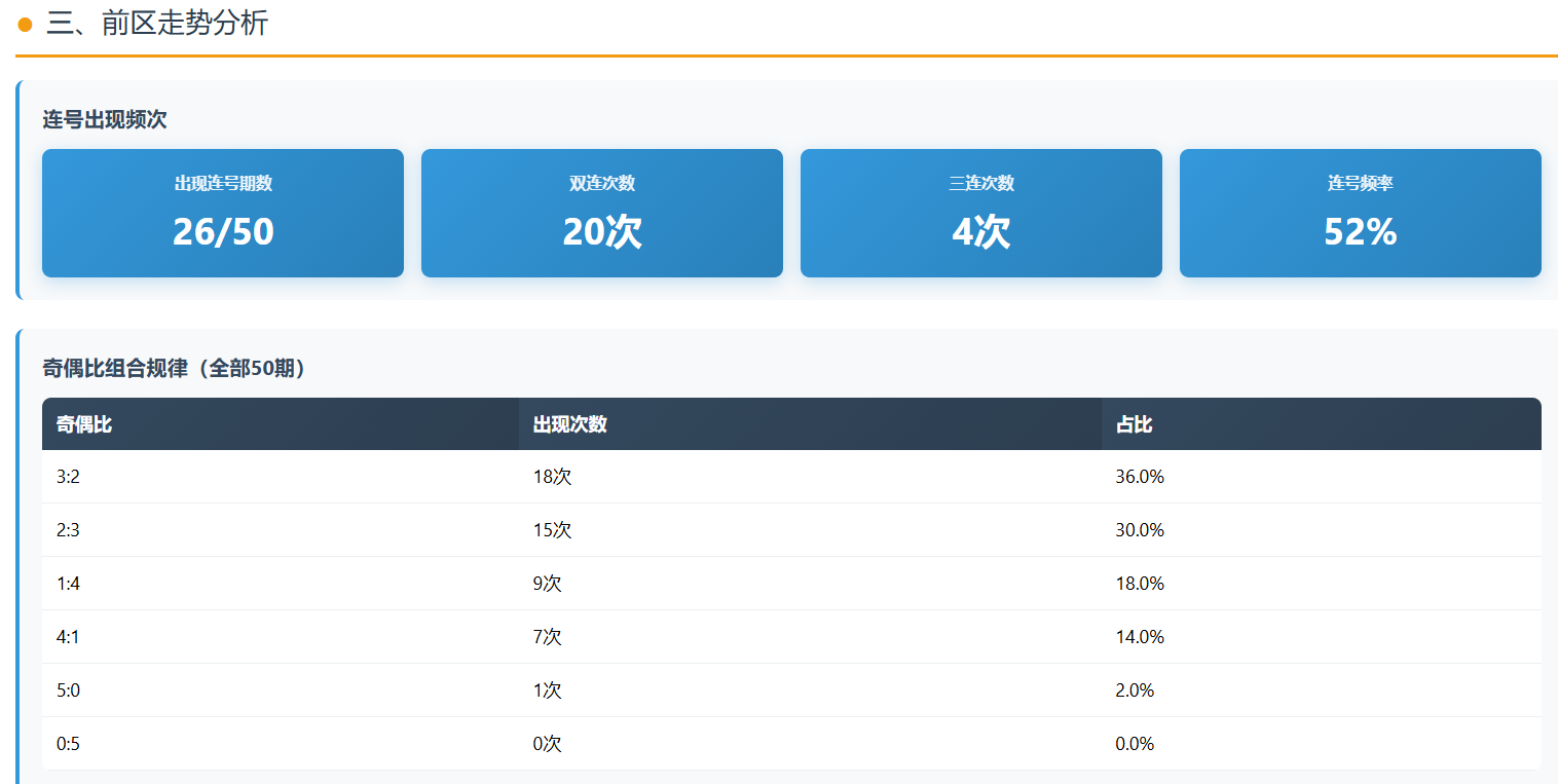 前区奇偶比方面,3:2出现18次,占比36%;2:3出现15次,占比30%。这两种组合占据了绝对主导地位。而4:1仅出现7次,占比14%。换句话说,上期的结构属于“偏离主流”,而走势往往有回归均衡的倾向。