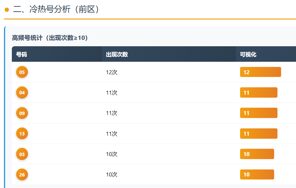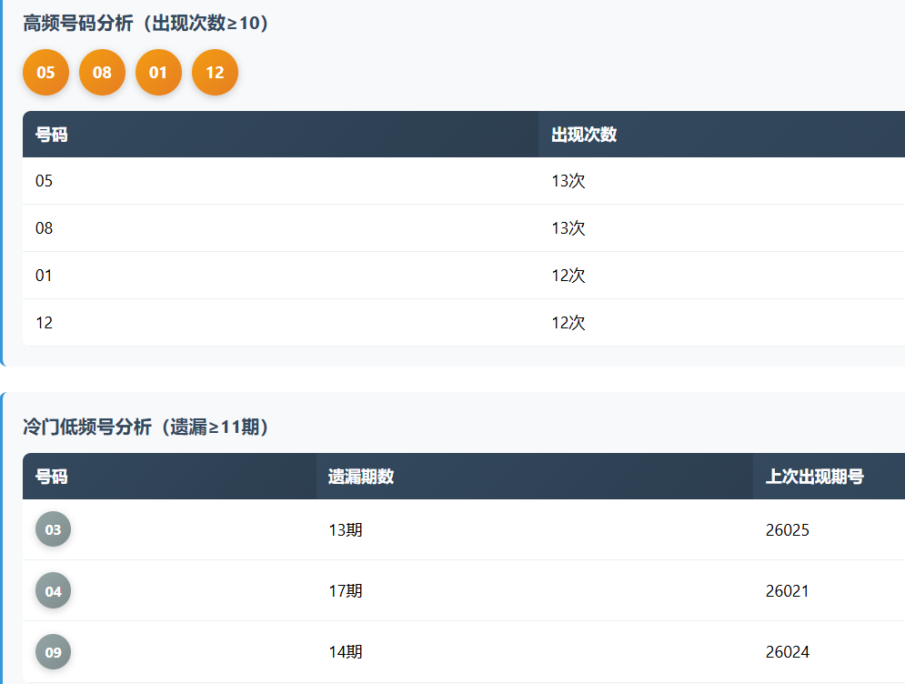 高频号方面,05、04、09、13、03、26等号码出现次数均在10次以上,活跃度较高,属于当前阶段的“常驻选手”。