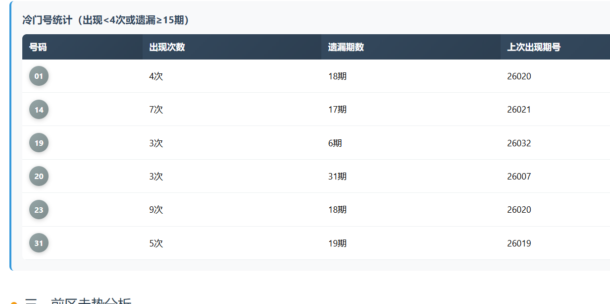 而冷门号则更具看点。01已经遗漏18期,上次出现在26020期;14遗漏17期;31遗漏19期;20更是长时间未见,遗漏达到31期。这些号码虽然沉寂,但往往在某个节点会突然回归,打破原有节奏。